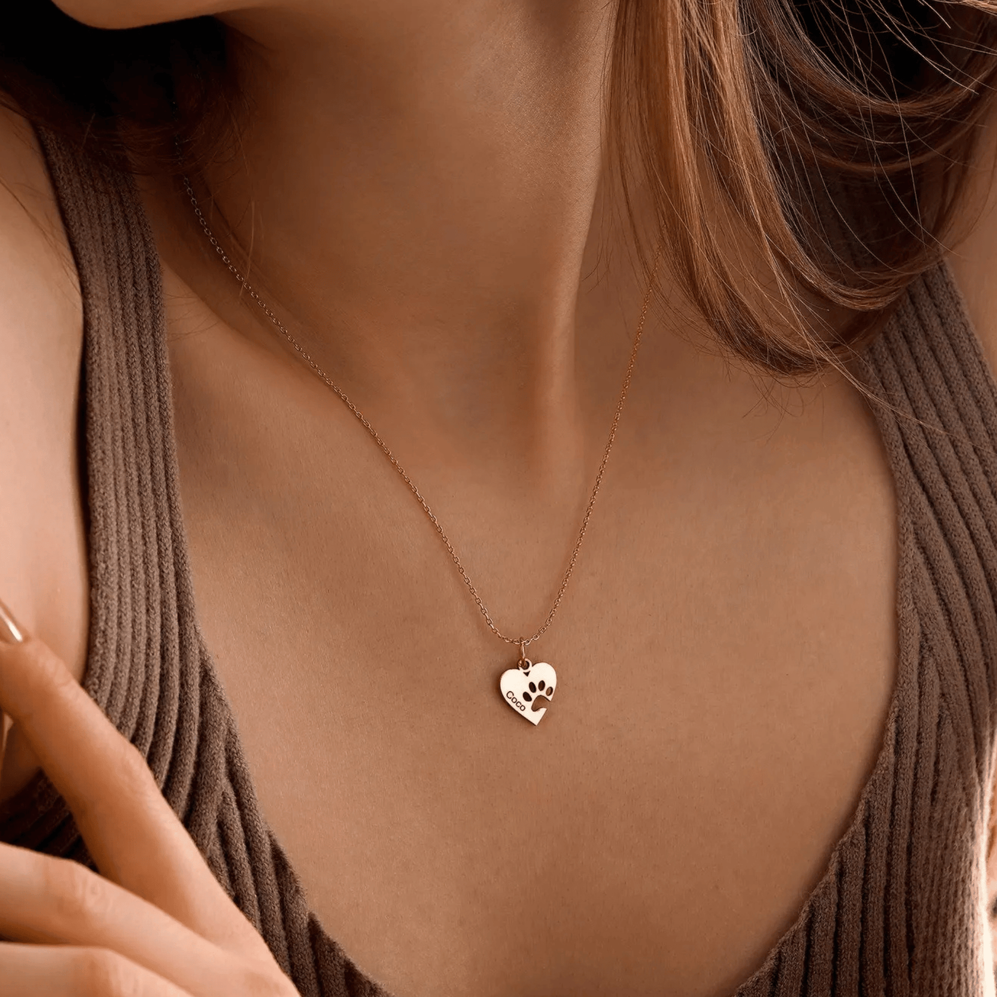Hold dit kæledyr tæt på dig med vores halskæde med pote og hjerte med navn. Hver halskæde har et sødt hjerte med en udskåret pote og dit navn indgraveret. Det er den perfekte gave til dyreelskere og en helt særlig måde at have dit kæledyr med dig hver dag.